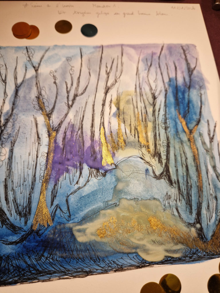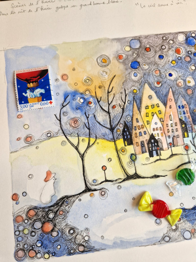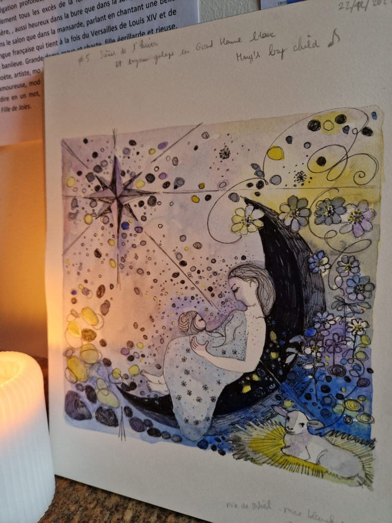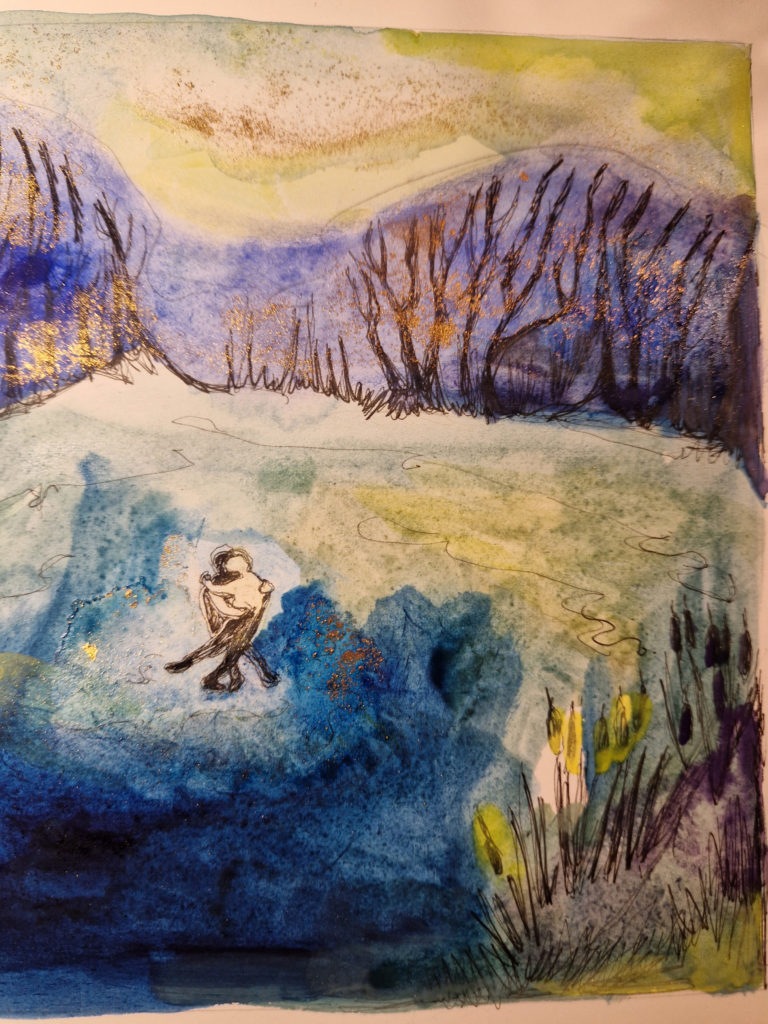 L’étang est gelé, gris, rose, parme, doré, de poudre argentée. Les canards ne changent rien à leur habitudes qui sont de dandiner et de suivre sans parler la marche hallucinante et lente d’un jour comme tous les autres. Nous observons la vaste étendue abandonnée à elle-même. Quelques roseaux se penchent avec nous sur la glace où nous posons un pied, puis un autre. Pas à pas, les enfants s’aventurent à marcher sur l’eau. Je les imagine dans un conte d’Andersen où ils patineraient sur l’eau d’une fontaine surmontée par d’incroyables quadrilles de chevaux encadrant le char de l’Aurore et où ils vendraient aussi des allumettes dans des habits élimés et sombres de déshérités. J’observe d’un œil Hansel et Gretel valsant avec les roseaux déliés et jouant de cannes et bâtons à poursuivre les pauvres poules d’eau récalcitrantes. Suivant mes pensées désenchaînées sur la glace ultime de la forêt de mes songes, je rêve à mon conte des mille et une nuits de l’hiver. Je vois ce même ciel immense et clair, un océan gelé à la surface du monde, et au beau milieu d’un silence éternel, un couple enlacé dans ses habits de fête.
