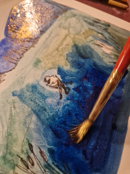 L’étang est gelé, gris, rose, parme, doré, de poudre argentée. Les canards ne changent rien à leur habitudes qui sont de dandiner et de suivre sans parler la marche hallucinante et lente d’un jour comme tous les autres. Nous observons la vaste étendue abandonnée à elle-même. Quelques roseaux se penchent avec nous sur la glace où nous posons un pied, puis un autre. Pas à pas, les enfants s’aventurent à marcher sur l’eau. Je les imagine dans un conte d’Andersen où ils patineraient sur l’eau d’une fontaine surmontée par d’incroyables quadrilles de chevaux encadrant le char de l’Aurore et où ils vendraient aussi des allumettes dans des habits élimés et sombres de déshérités. J’observe d’un œil Hansel et Gretel valsant avec les roseaux déliés et jouant de cannes et bâtons à poursuivre les pauvres poules d’eau récalcitrantes. Suivant mes pensées désenchaînées sur la glace ultime de la forêt de mes songes, je rêve à mon conte des mille et une nuits de l’hiver. Je vois ce même ciel immense et clair, un océan gelé à la surface du monde, et au beau milieu d’un silence éternel, un couple enlacé dans ses habits de fête.